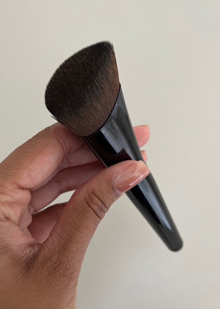But what really sets it apart is the shape. It’s not your typical flat or domed brush — the design is subtly sculpted in a way that hugs the natural contours of the face. It easily reaches those often tricky areas: the corners of the nose, under the eyes, along the jawline, and around the hairline. No patchiness, no missed spots — just smooth, even coverage that feels polished but still skin-like.